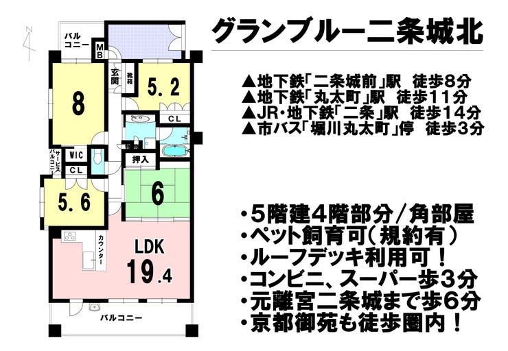 | アクセス | 京都市営地下鉄東西線『二条城前』 徒歩8分 (約640m) 京都市営地下鉄烏丸線『丸太町』 徒歩11分 (約880m) JR山陰本線『二条』 徒歩14分 (約1120m) 市バス『「堀川丸太町」停』 徒歩3分 (約190m) |